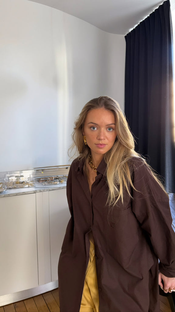 La Chemise Essential est confectionnée en popeline de coton de haute qualité, une matière à la fois légère, respirante et structurée. Sa coupe oversize assure confort et élégance au quotidien, tandis que le logo brodé ton sur ton sur la poche poitrine vient signer discrètement l’identité de la maison.