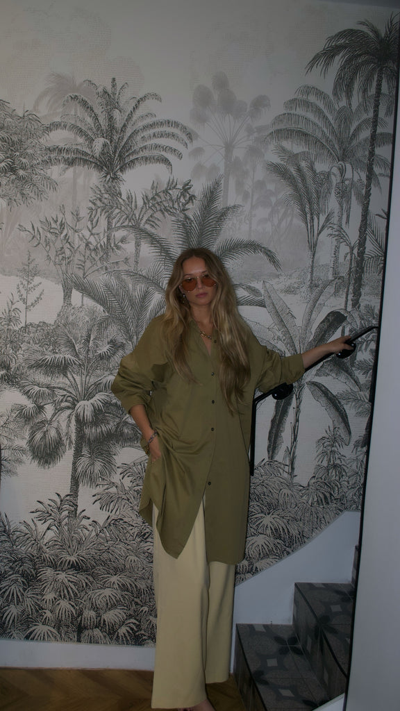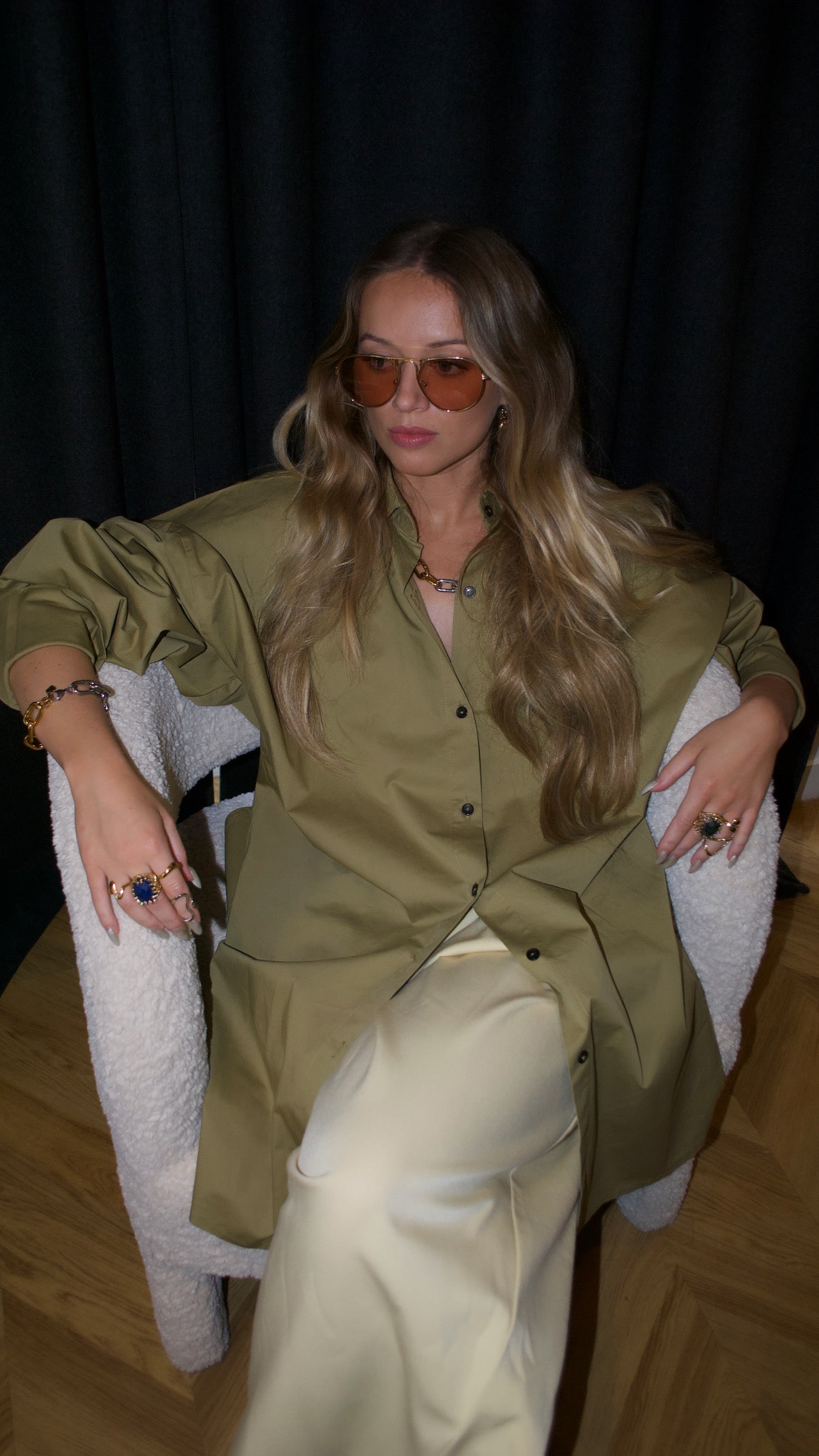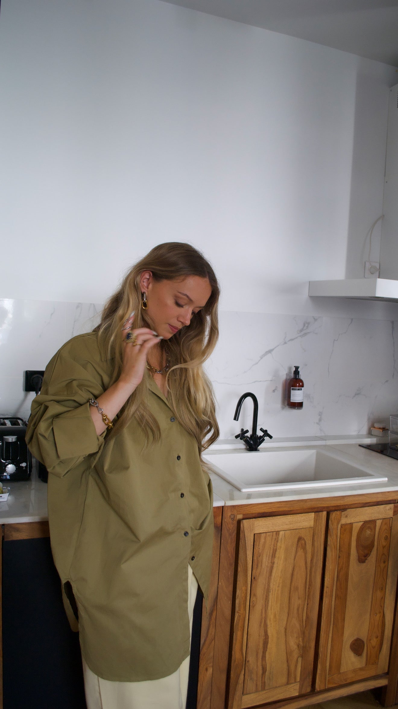 Cette chemise oversize, confectionnée en toile de coton lavé de qualité, offre une coupe généreuse et fluide qui allie confort et style. Sa couleur kaki, élégante et moderne, se marie facilement avec des tons neutres ou contrastés.