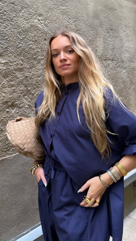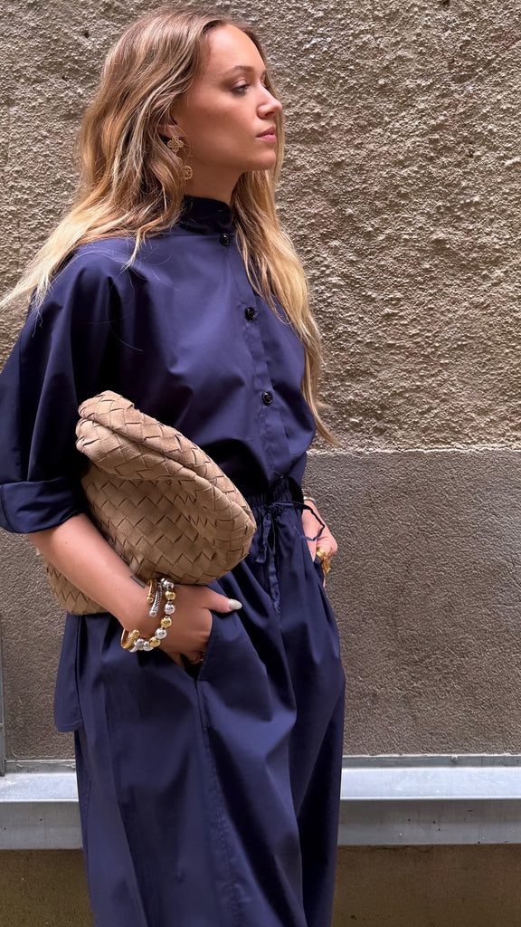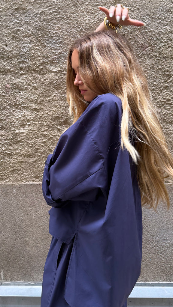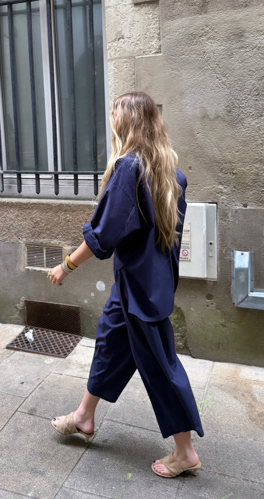 Conçu en toile de coton camel de qualité, cet ensemble se compose d’une chemise oversize et d’un pantalon ballon. La chemise, subtilement asymétrique, se distingue par un dos plus long que le devant et des plis travaillés à l’arrière pour créer du volume et du mouvement. Le pantalon ballon, ample et structuré, complète la silhouette en apportant confort et modernité.
