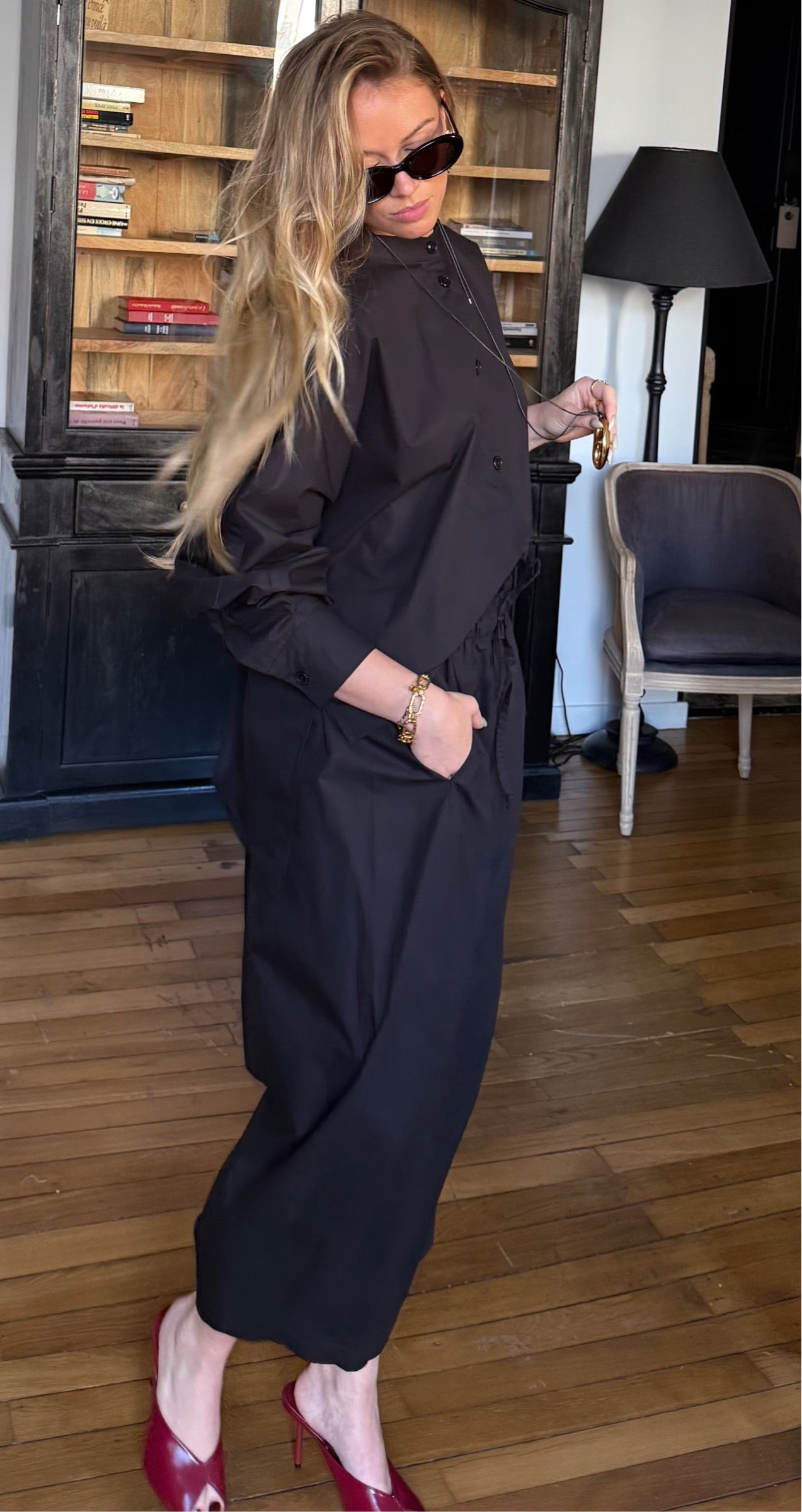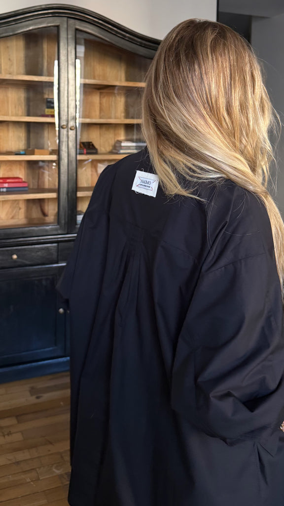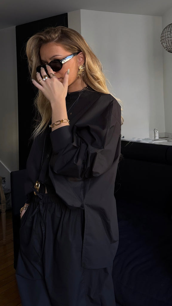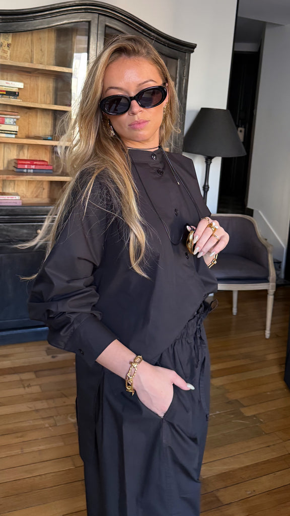 Conçu en toile de coton camel de qualité, cet ensemble se compose d’une chemise oversize et d’un pantalon ballon. La chemise, subtilement asymétrique, se distingue par un dos plus long que le devant et des plis travaillés à l’arrière pour créer du volume et du mouvement. Le pantalon ballon, ample et structuré, complète la silhouette en apportant confort et modernité.