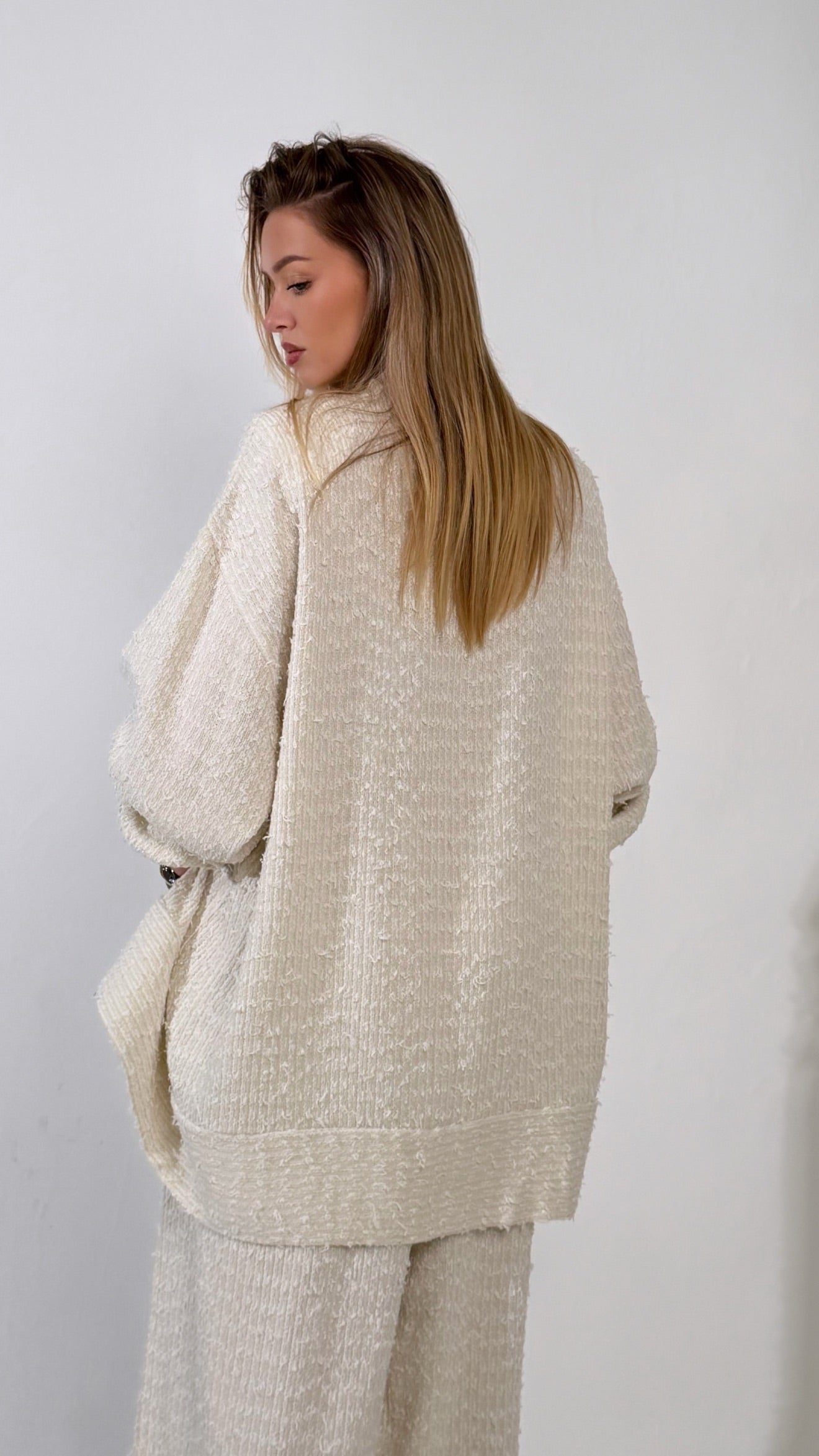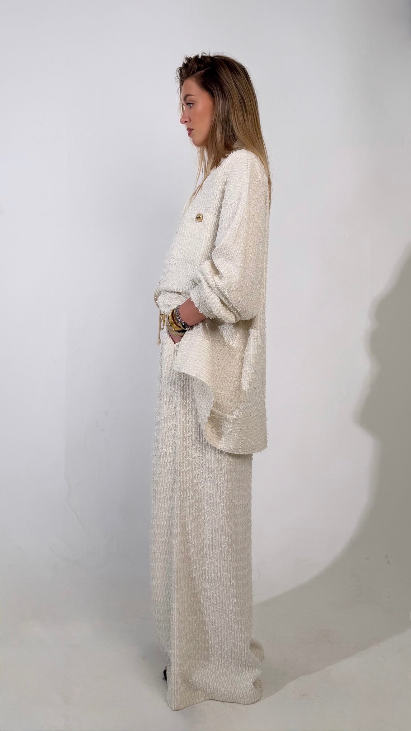 Une silhouette signature qui revisite l’ensemble Dynastie dans une nouvelle matière au caractère affirmé. Confectionné dans un tweed écru texturé, cet ensemble apporte structure, élégance et modernité à la silhouette.