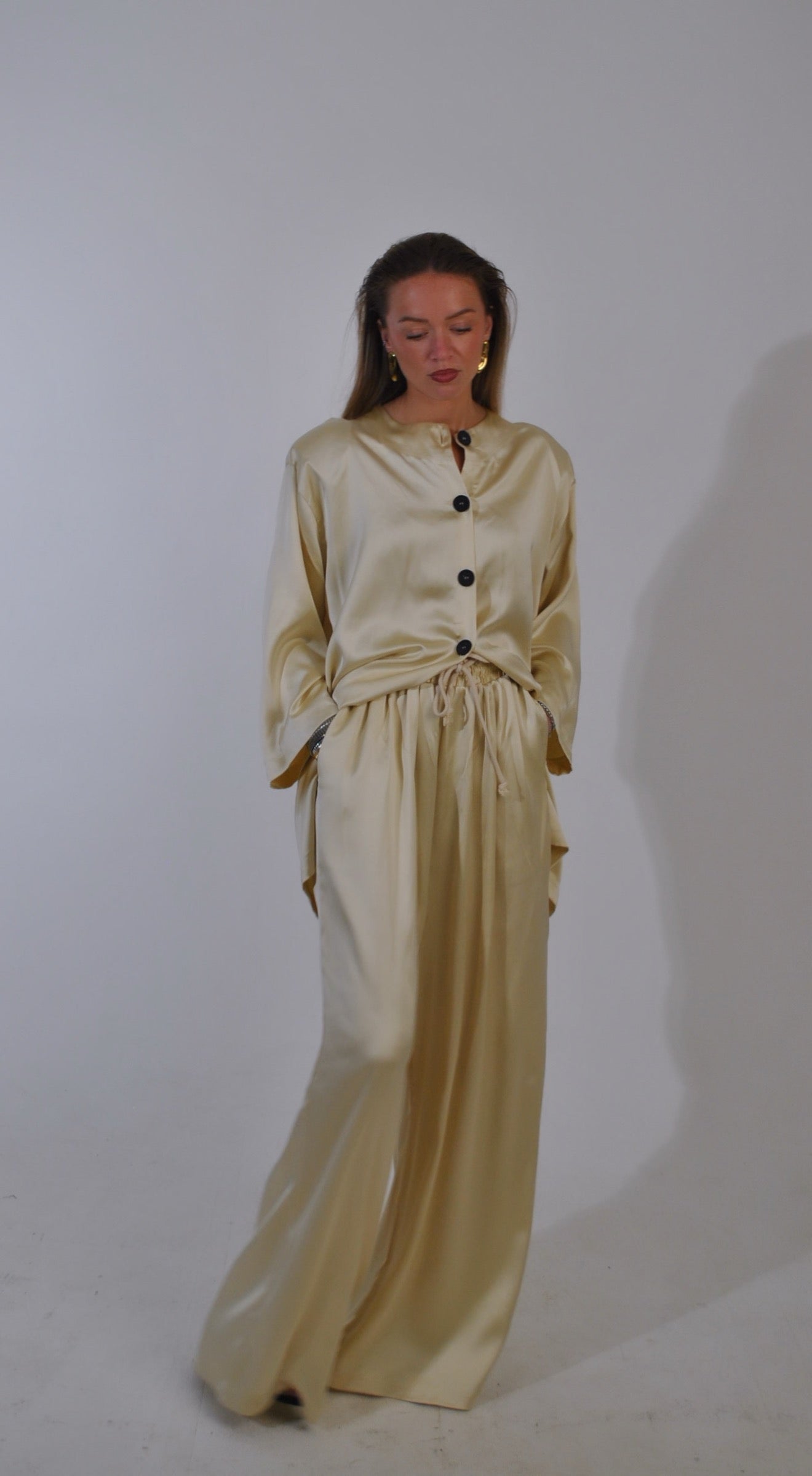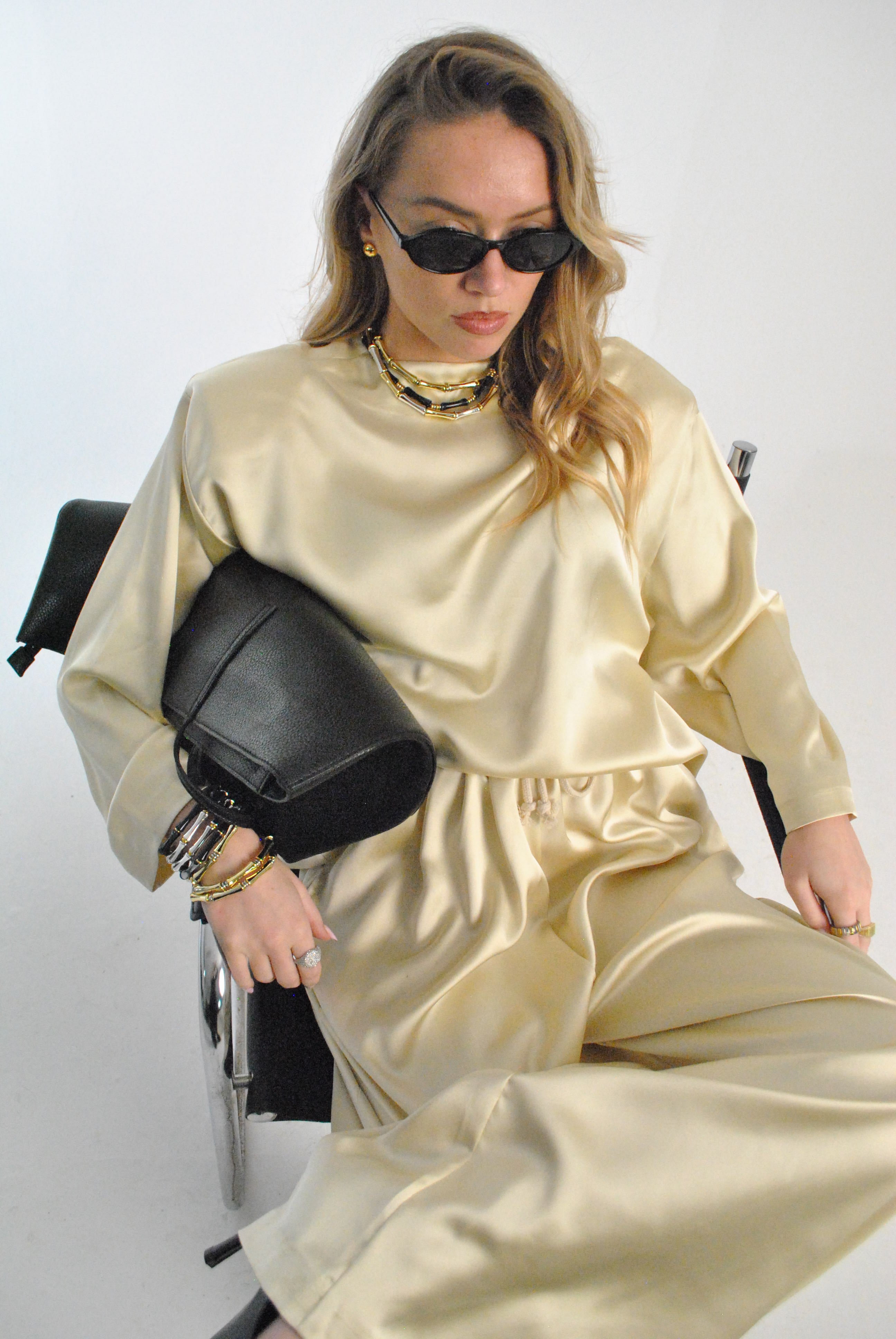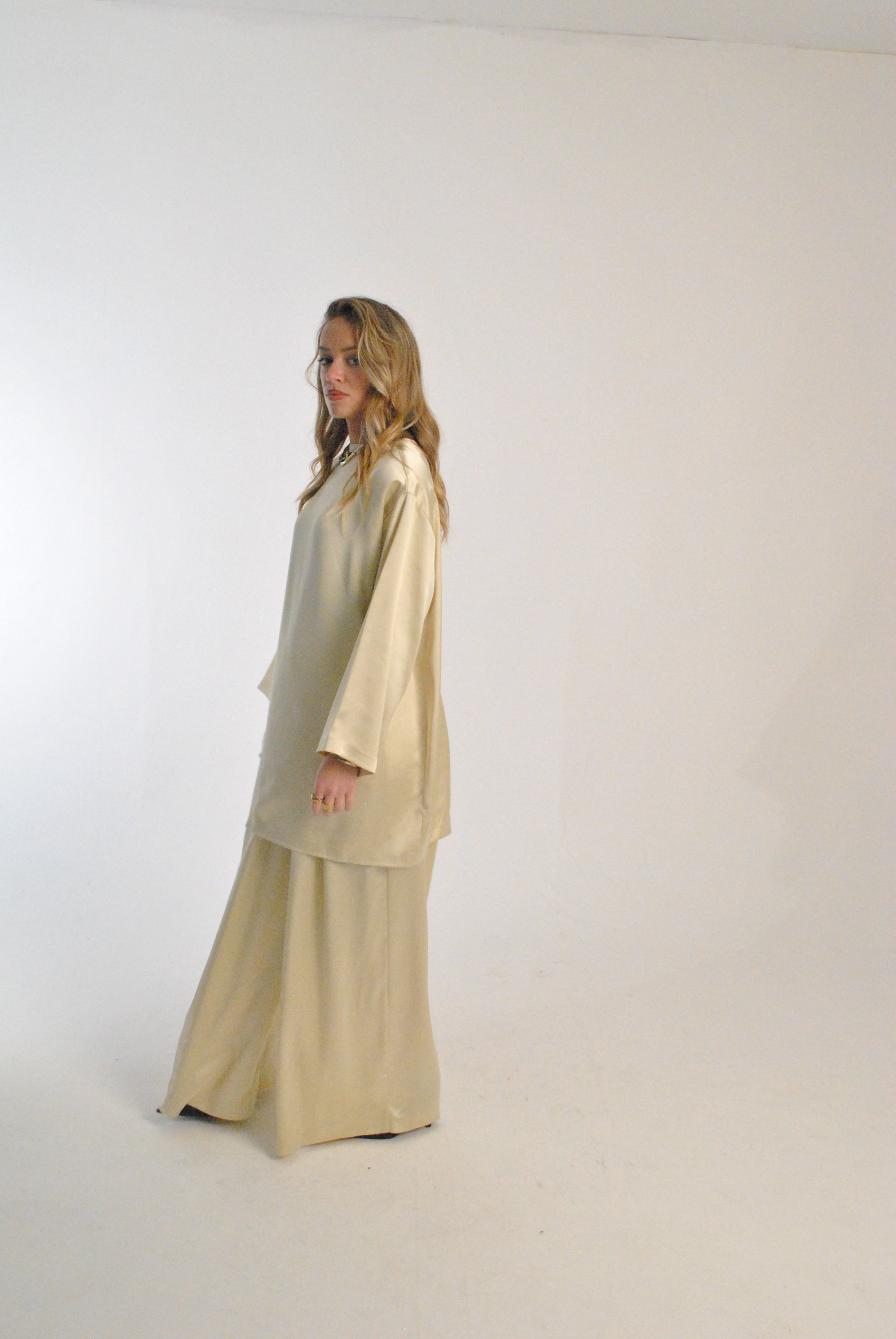 Un ensemble fluide et lumineux qui incarne l’élégance minimaliste de Naimo. Confectionné dans une crêpe de satin délicatement brillant, il capte la lumière avec subtilité et crée une silhouette à la fois sophistiquée et naturelle.