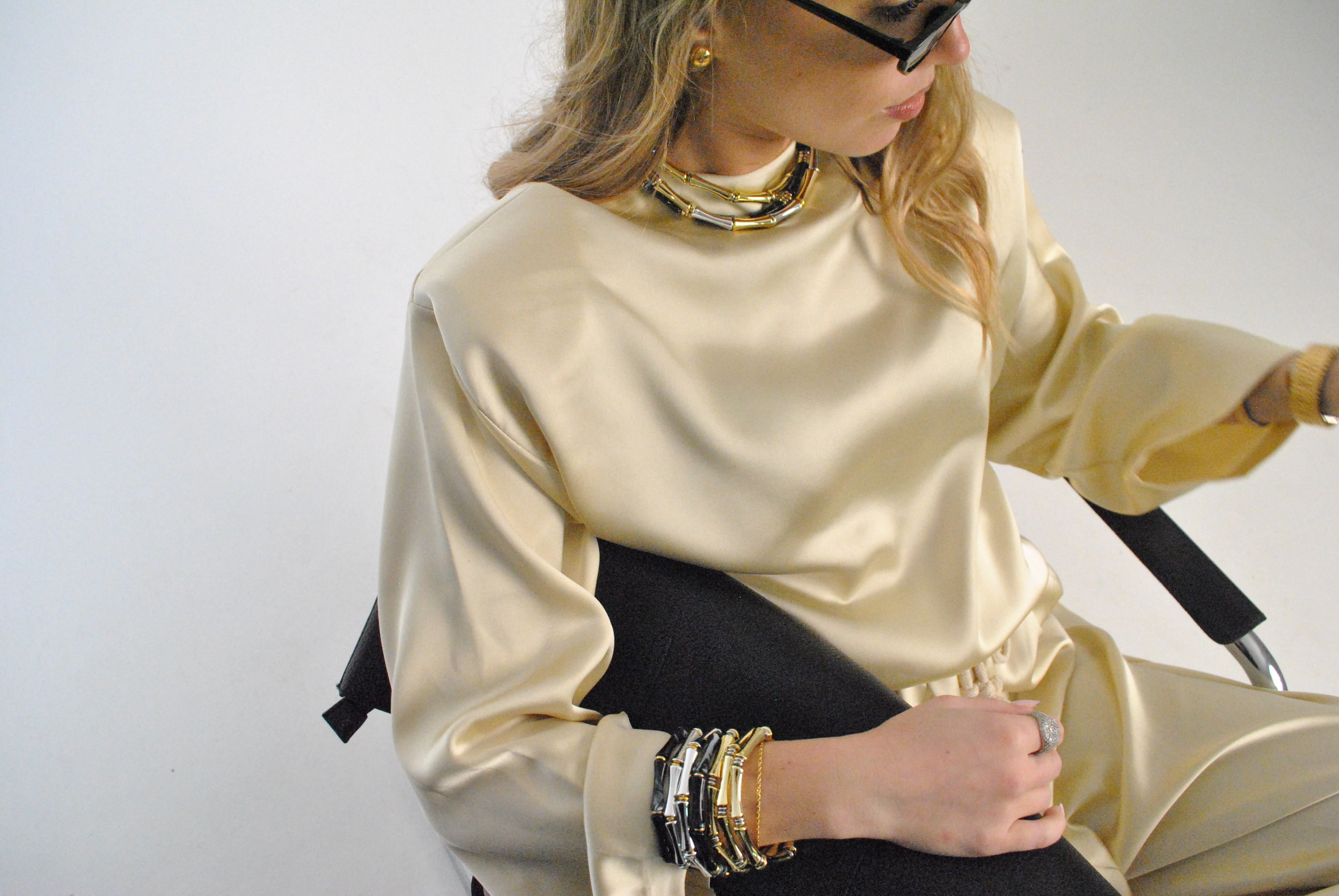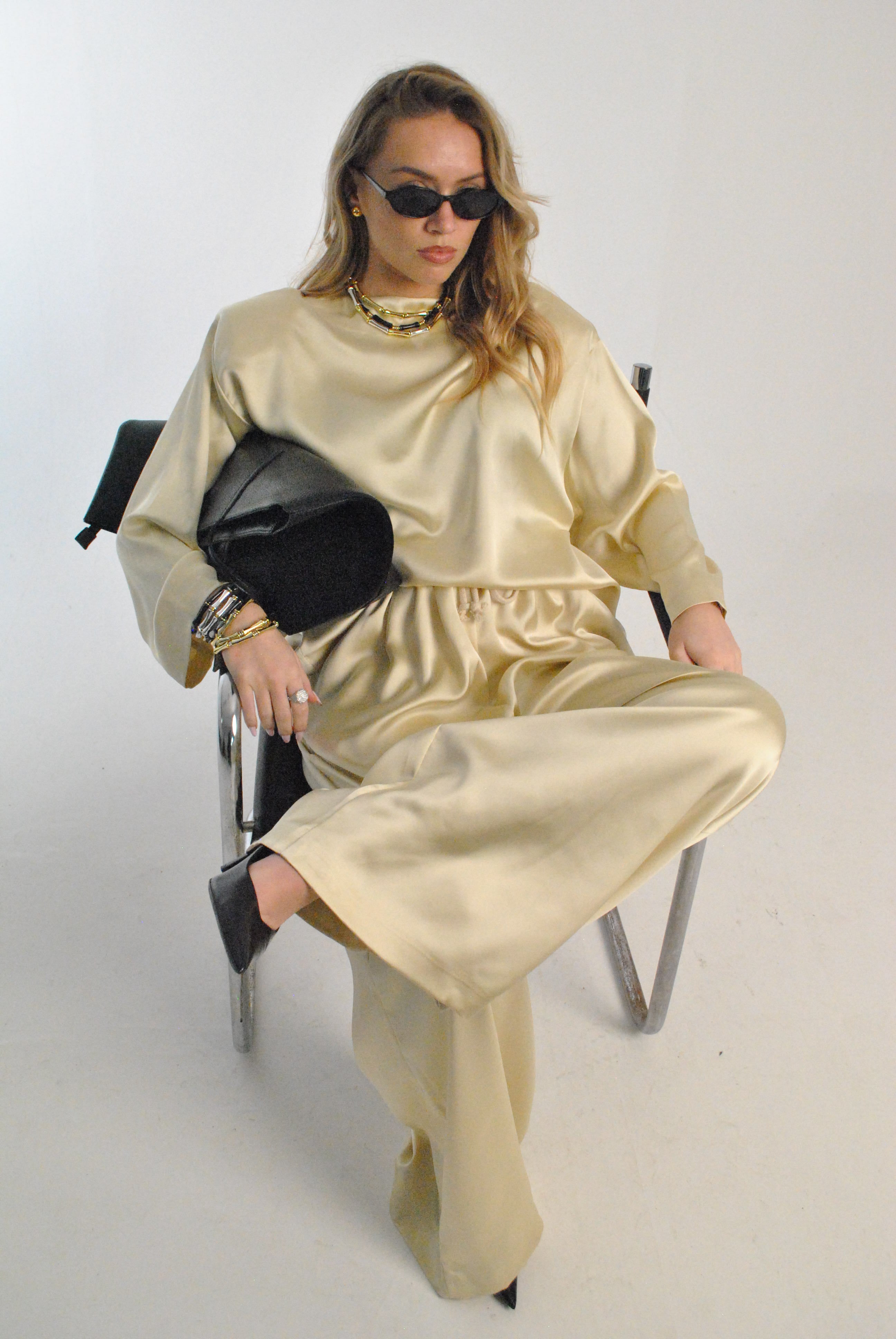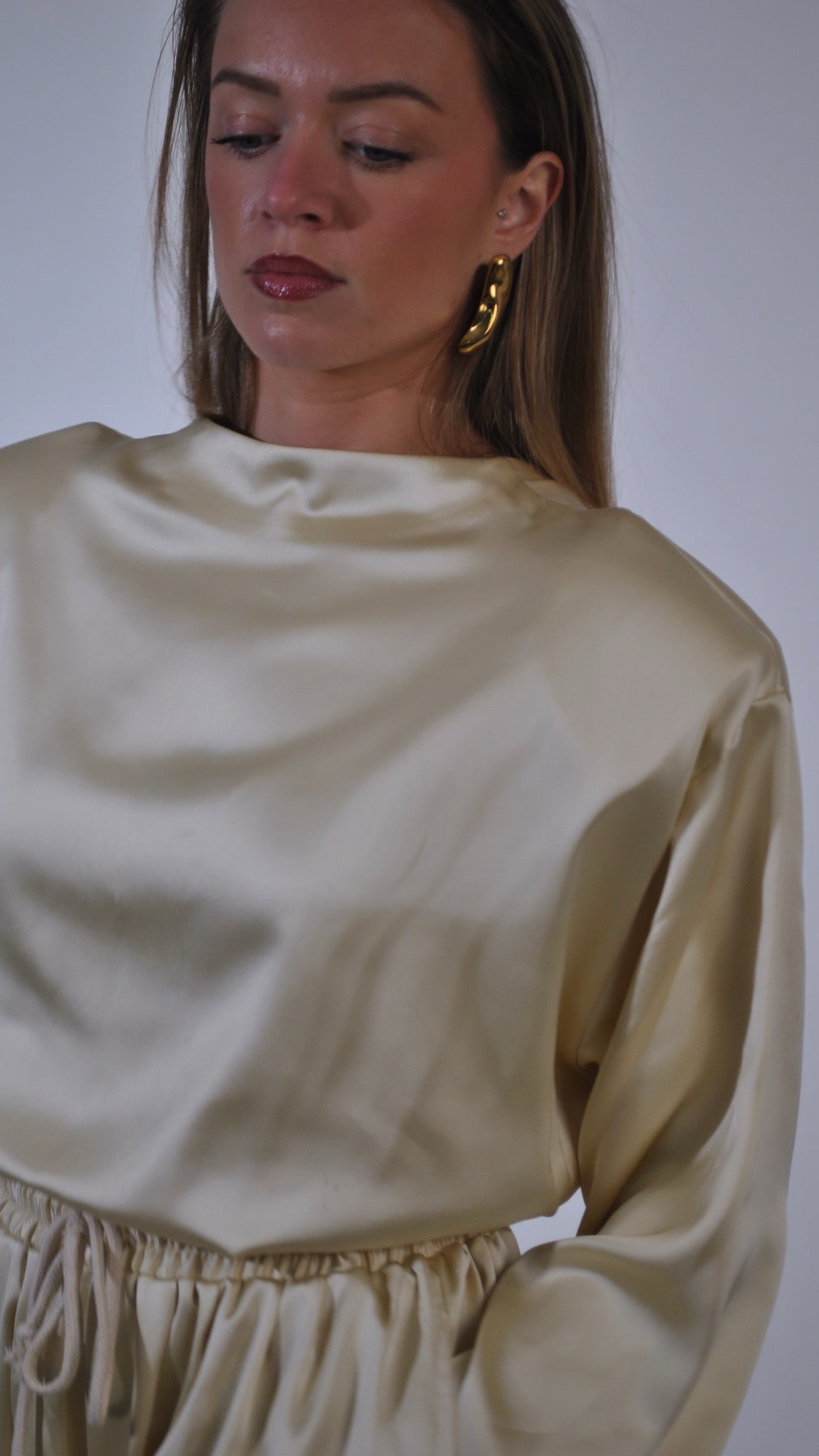 Un ensemble fluide et lumineux qui incarne l’élégance minimaliste de Naimo. Confectionné dans une crêpe de satin délicatement brillant, il capte la lumière avec subtilité et crée une silhouette à la fois sophistiquée et naturelle.