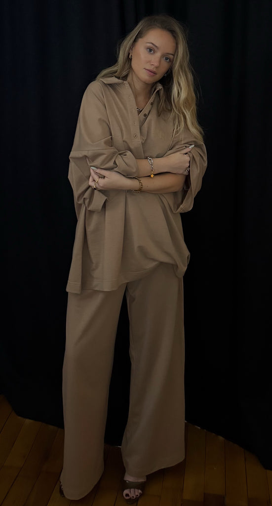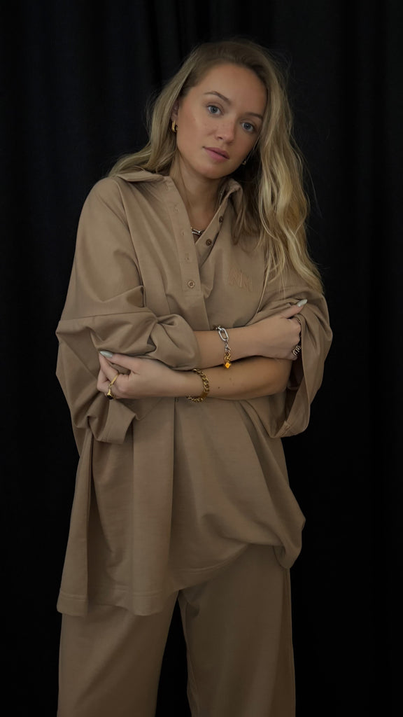 Le haut oversize à manches larges et col boutonné s’accorde naturellement avec le pantalon jogging taille élastiquée, souligné par des boutons sur le devant. Une coupe fluide, moderne et facile à porter, qui conjugue décontraction et élégance discrète.