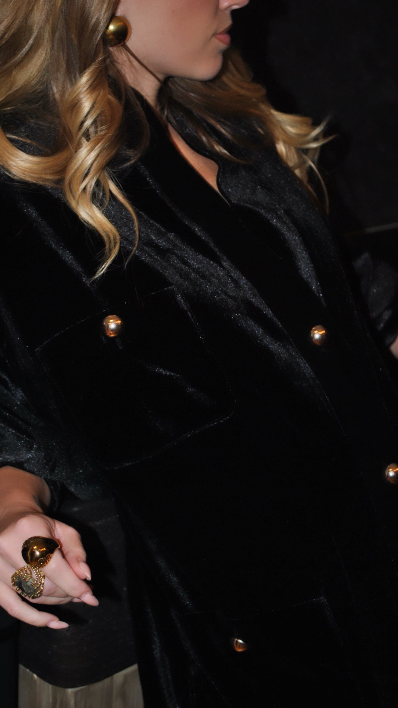 La veste oversize, structurée par de fines épaulettes, présente de grandes poches plaquées et des boutons bijoux qui apportent une touche précieuse. Elle se porte ouverte ou fermée pour varier les styles.