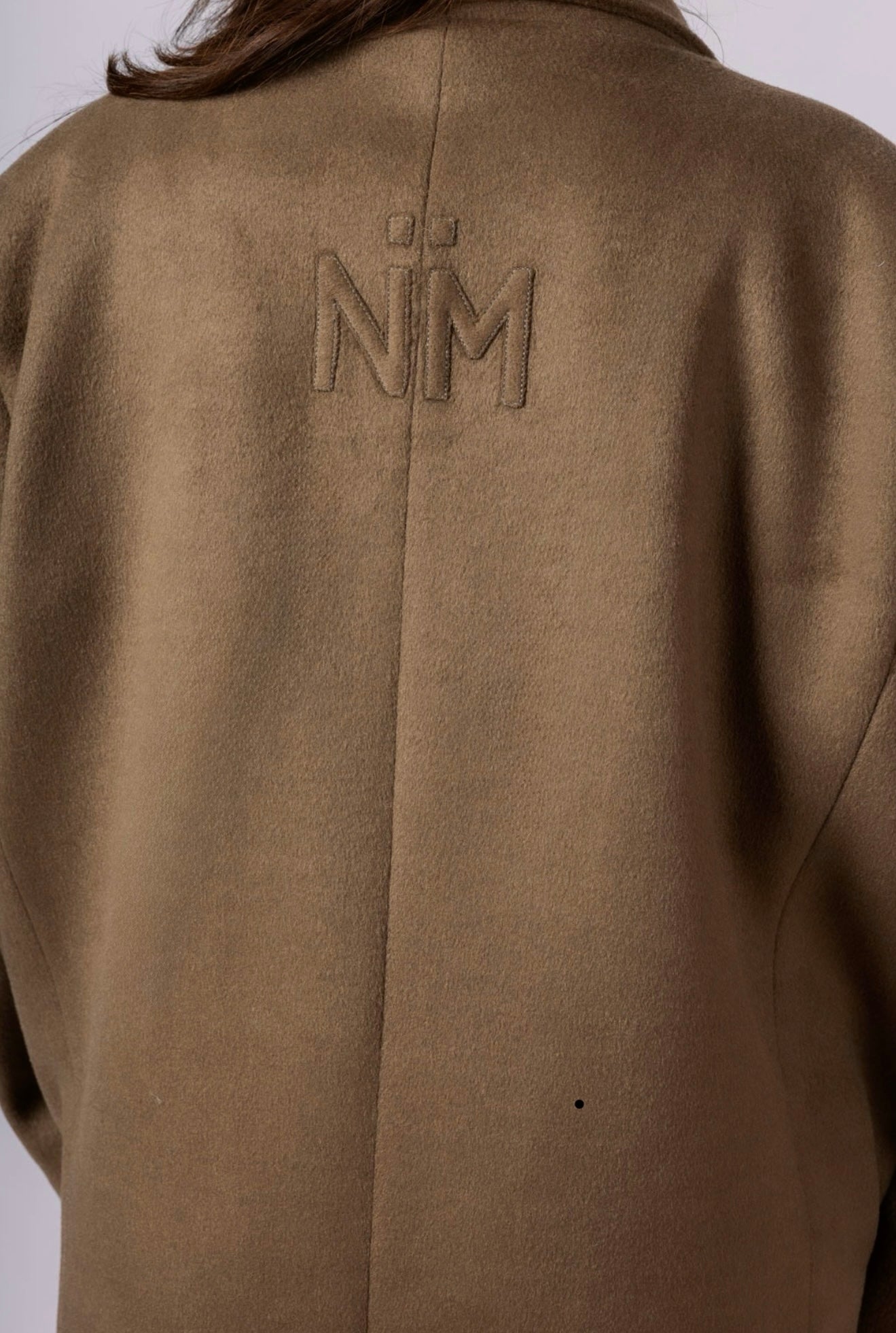 une broderie NM ton-sur-ton, subtile, élégante, intégrée directement dans le dos du manteau.