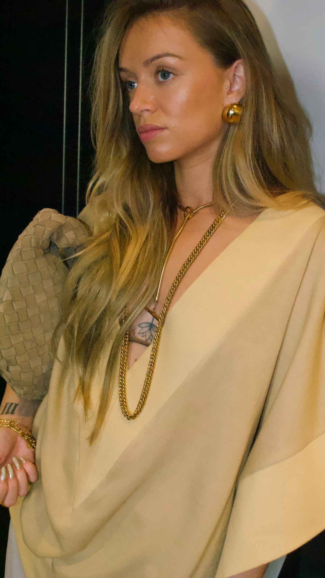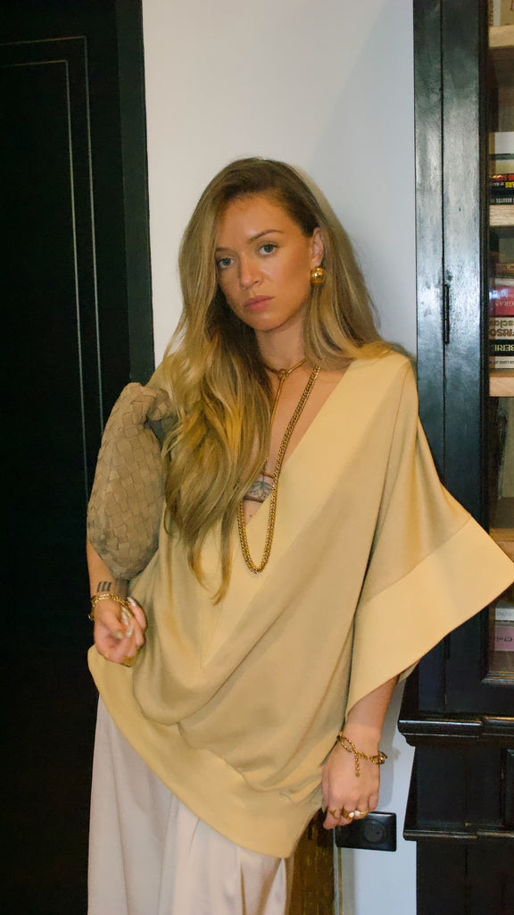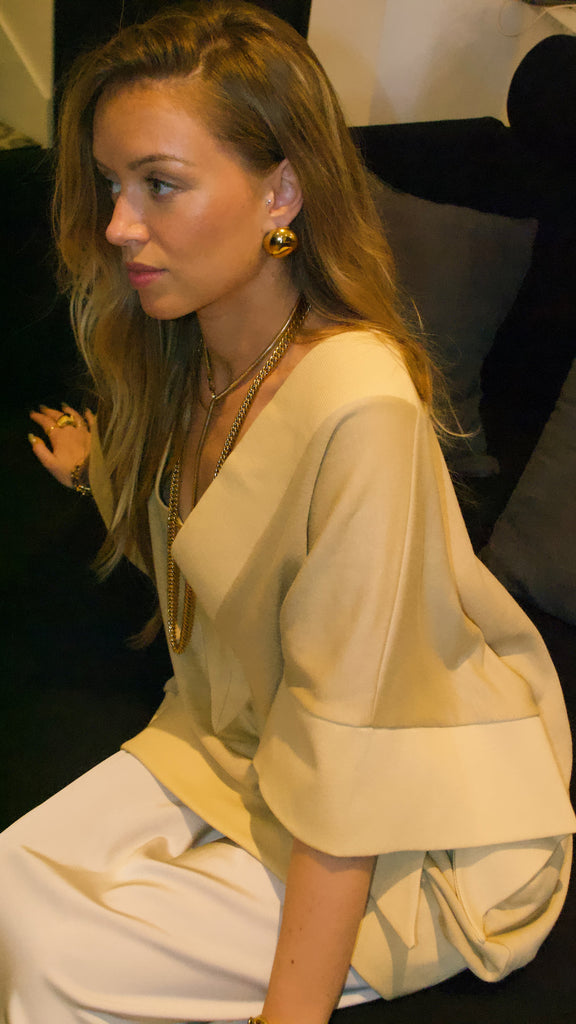 Un haut en molleton de coton à la coupe oversize, pensé pour allier confort et allure. Son décolleté en V profond, structuré par des empiècements larges et géométriques, lui confère une élégance moderne et affirmée. Les manches amples, façon kimono, apportent fluidité et mouvement, tout en gardant un esprit minimaliste et mode.