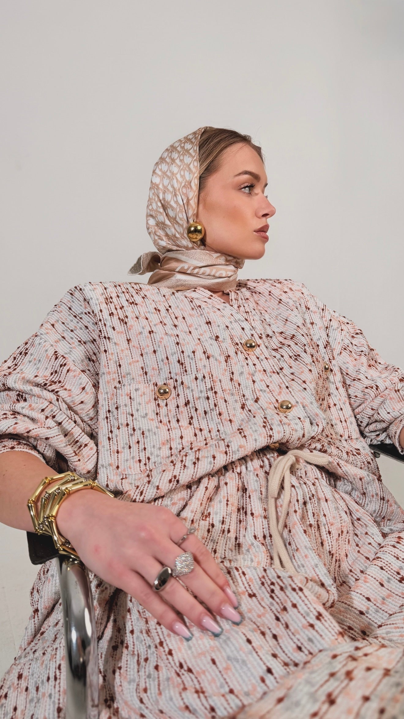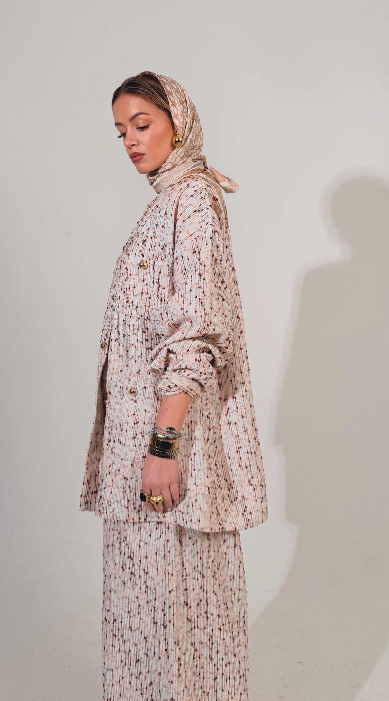 Une silhouette signature qui revisite l’ensemble Dynastie dans une nouvelle matière au caractère affirmé. Confectionné dans un tweed écru texturé, cet ensemble apporte structure, élégance et modernité à la silhouette.