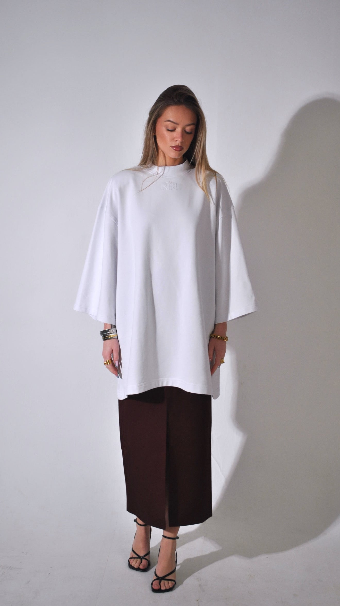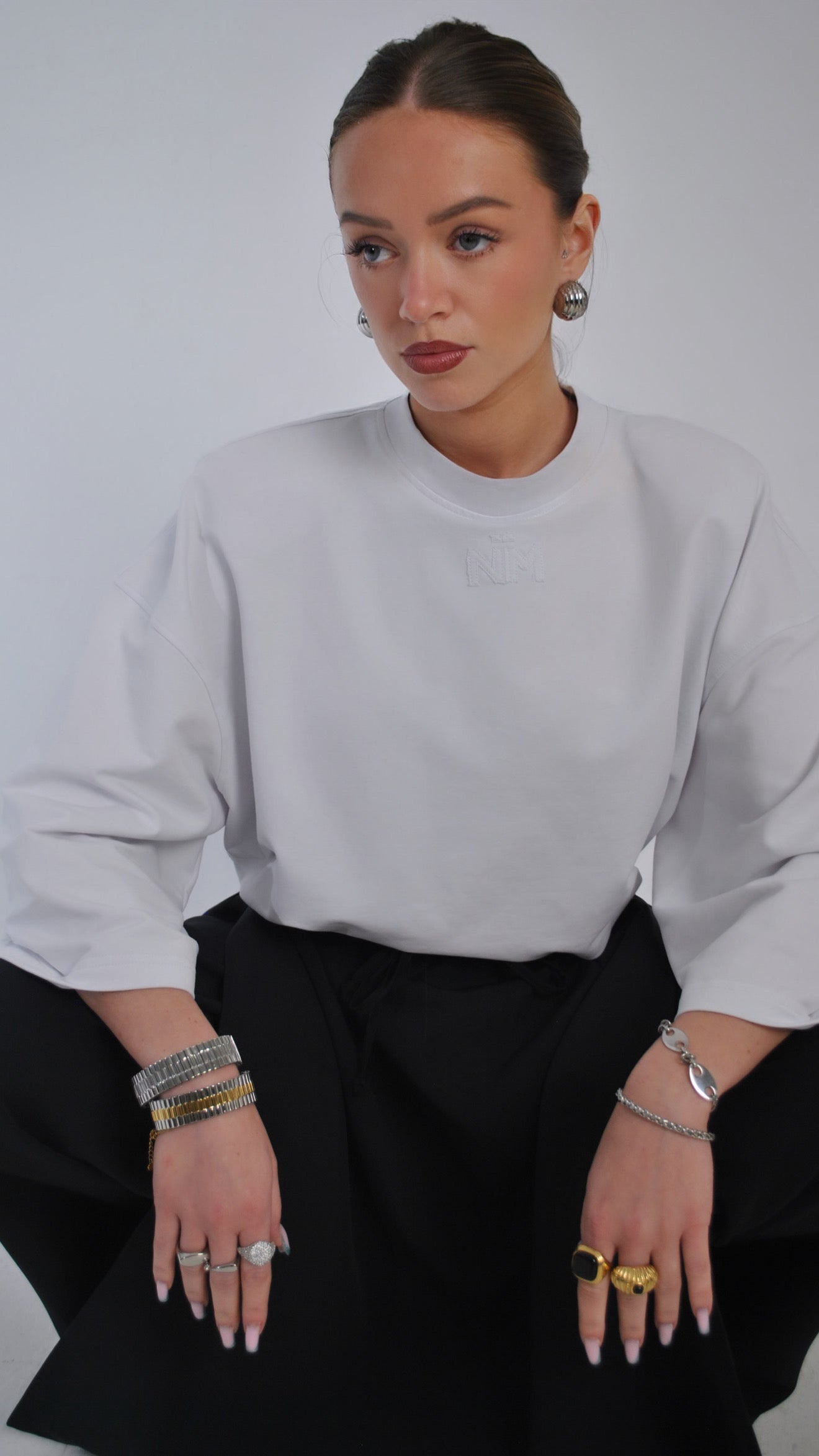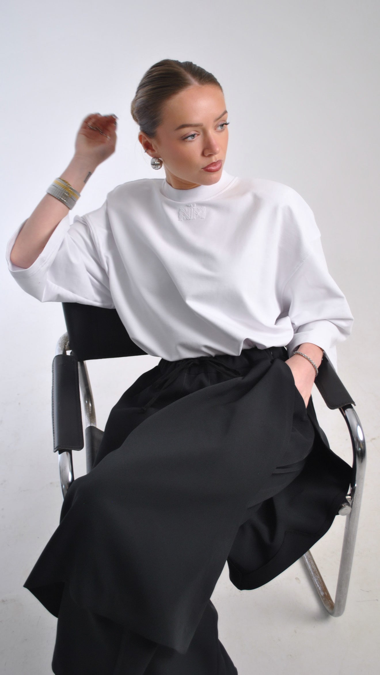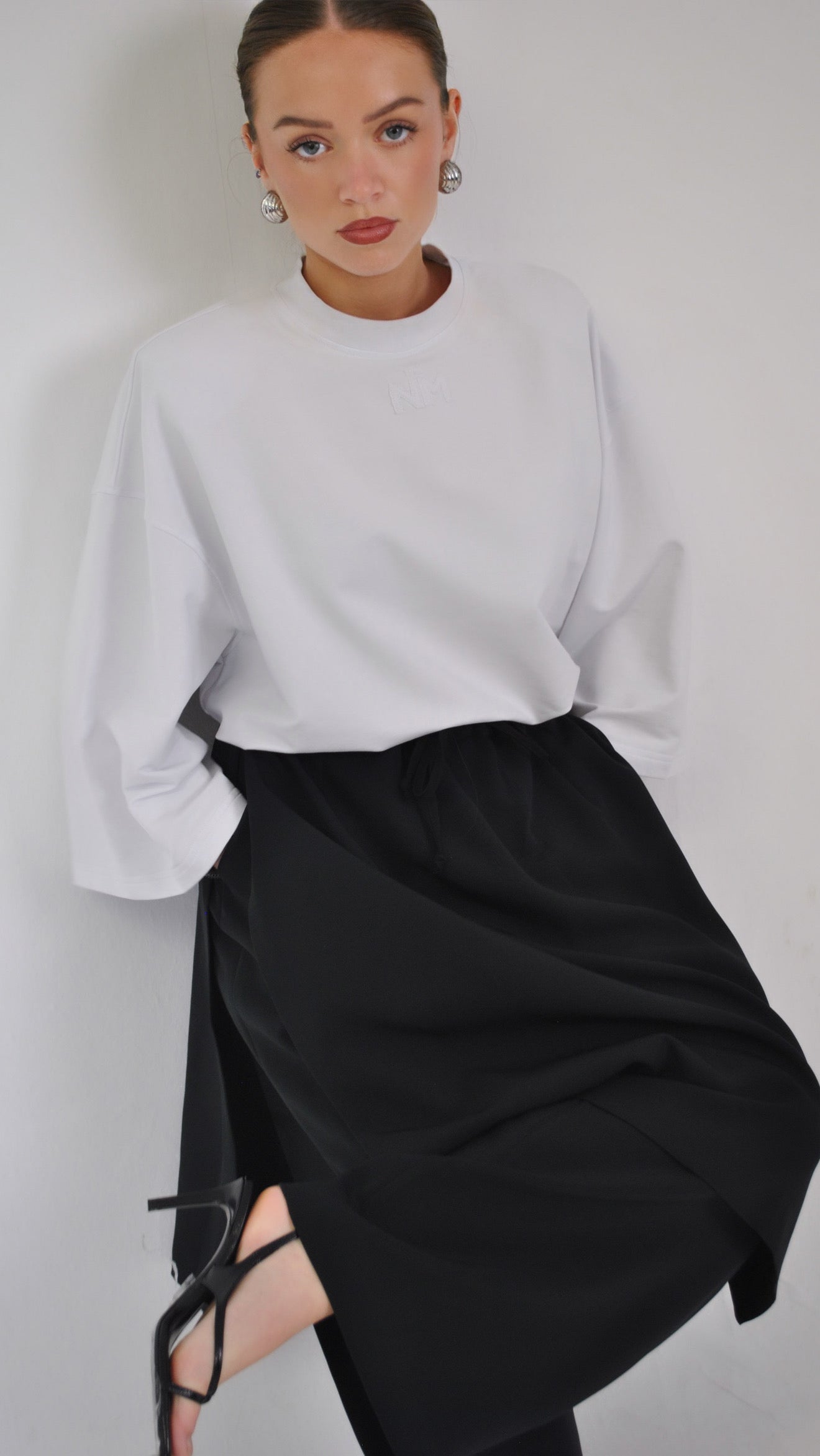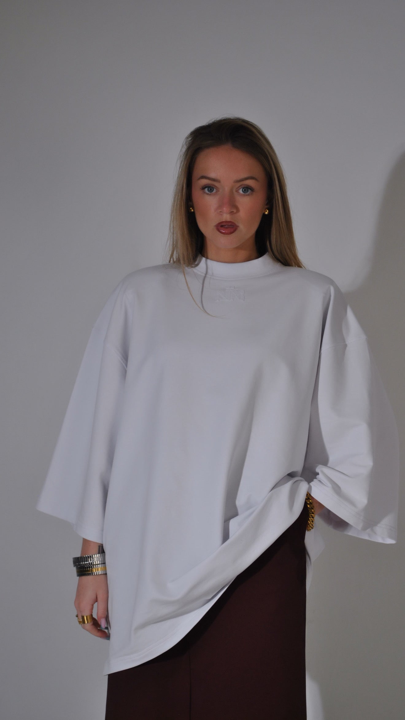 Sa coupe oversize structurée et ses manches larges créent une silhouette moderne et fluide, fidèle à l’univers Naimo. Le logo NM brodé ton sur ton sur le devant et l’étiquette signature Naimocollection Modesty With Intention au dos apportent une identité subtile et raffinée.
