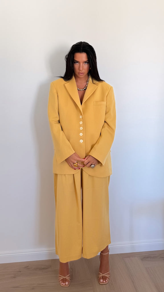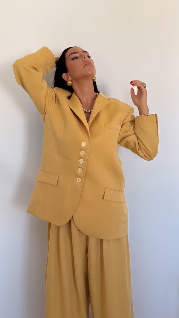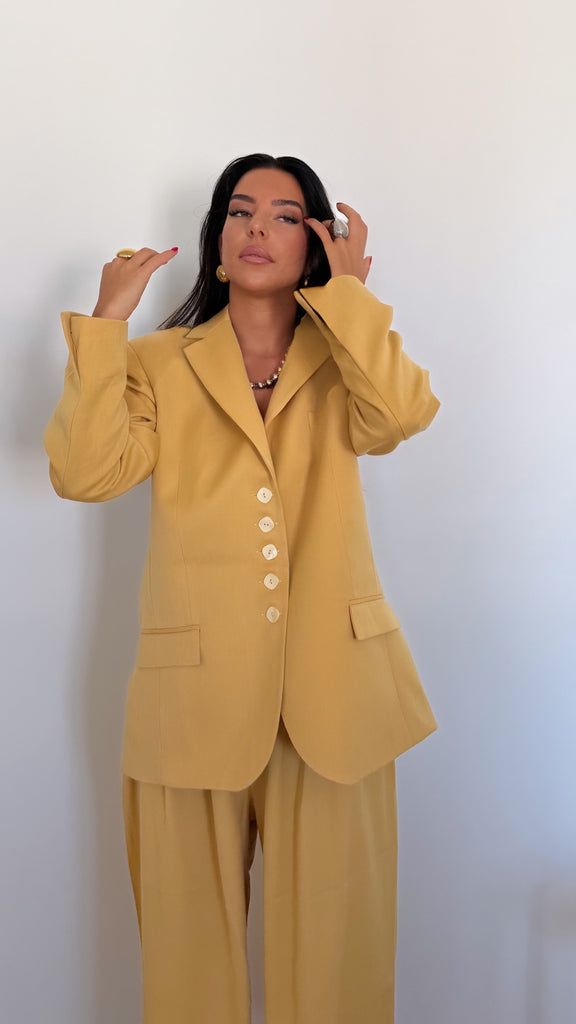 Pièce forte de la collection Mix & Match, le Blazer Atelier miel se distingue par sa matière en toile structurée et son travail de coupe précis réalisé par un tailleur.