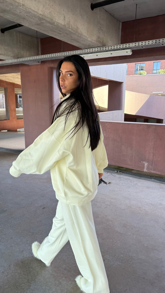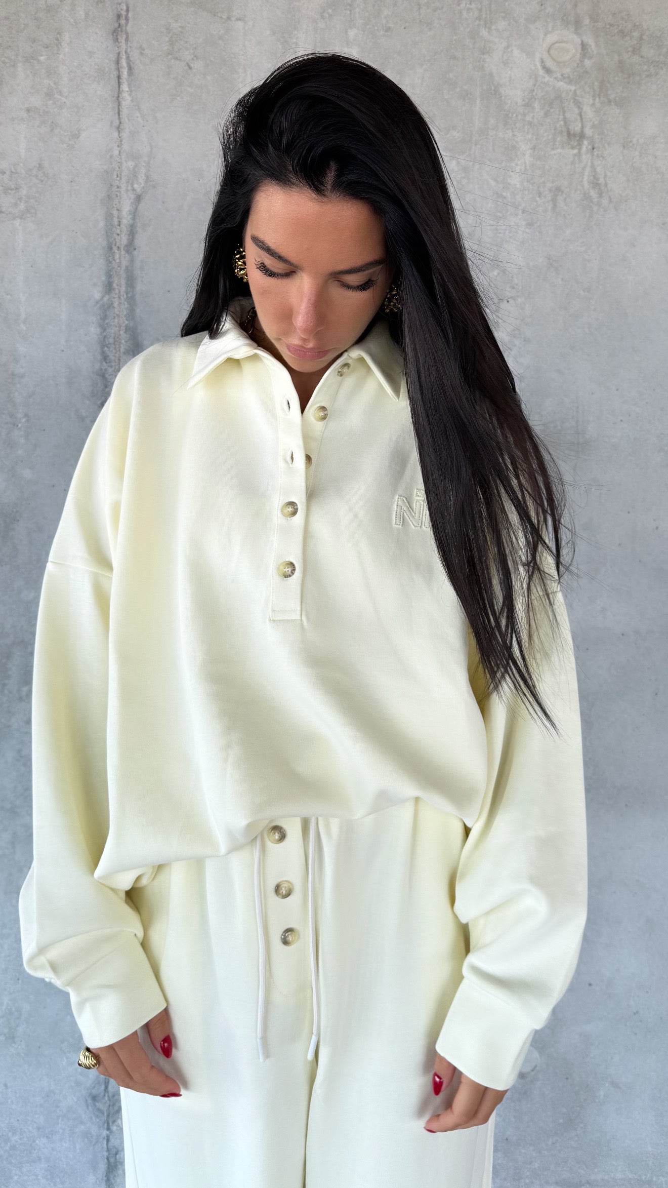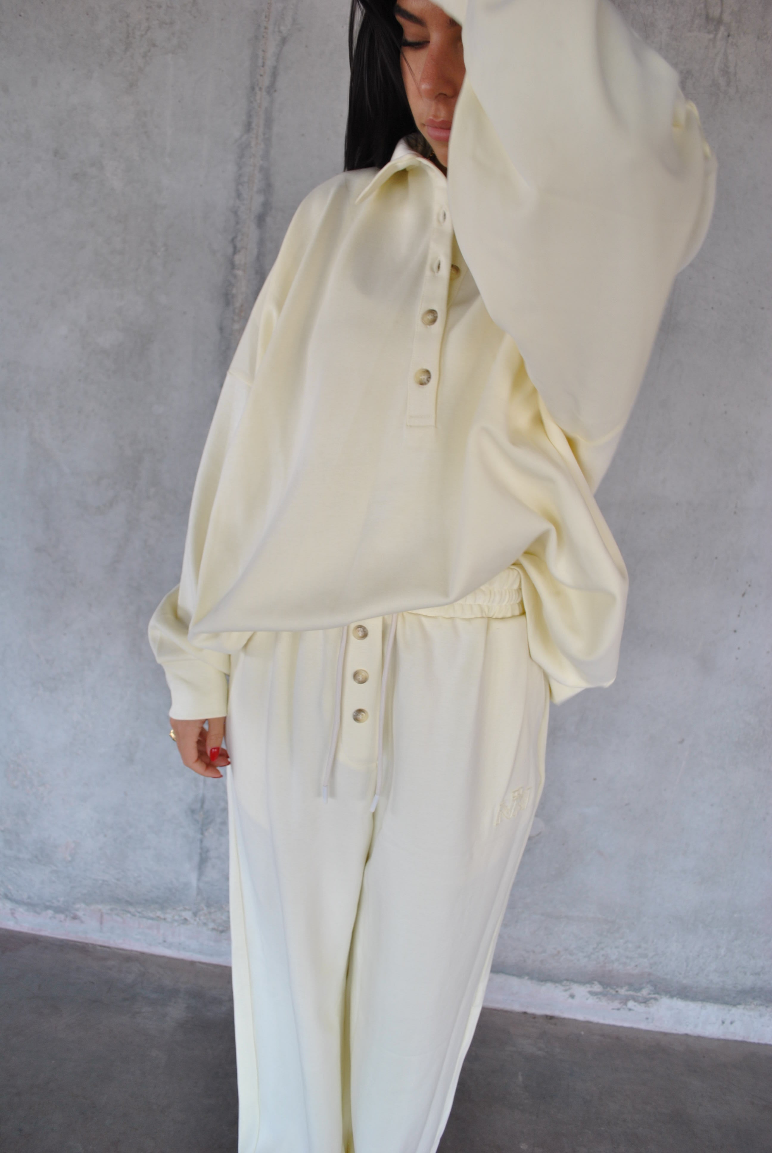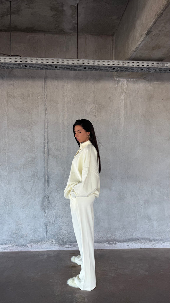 Sa coupe fluide et légèrement oversize lui donne une allure chic et décontractée à la fois ,un jogging revisité à l’esprit couture, typique de l’univers Naïmo.