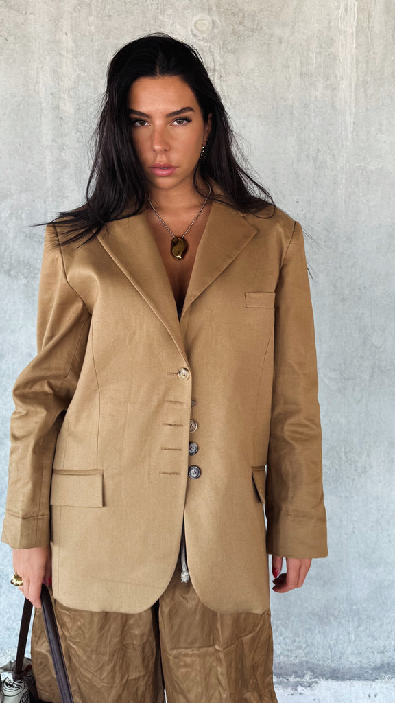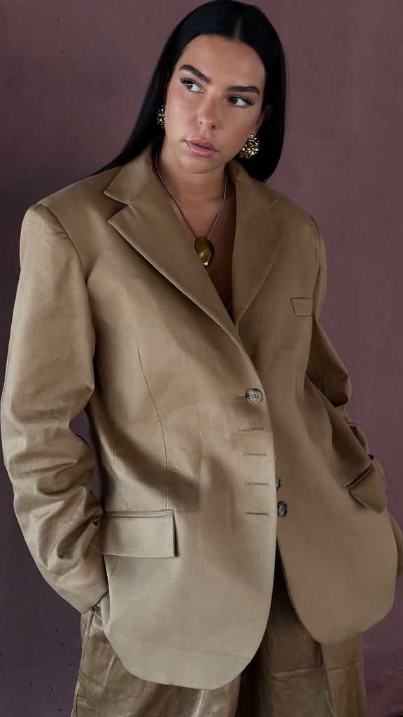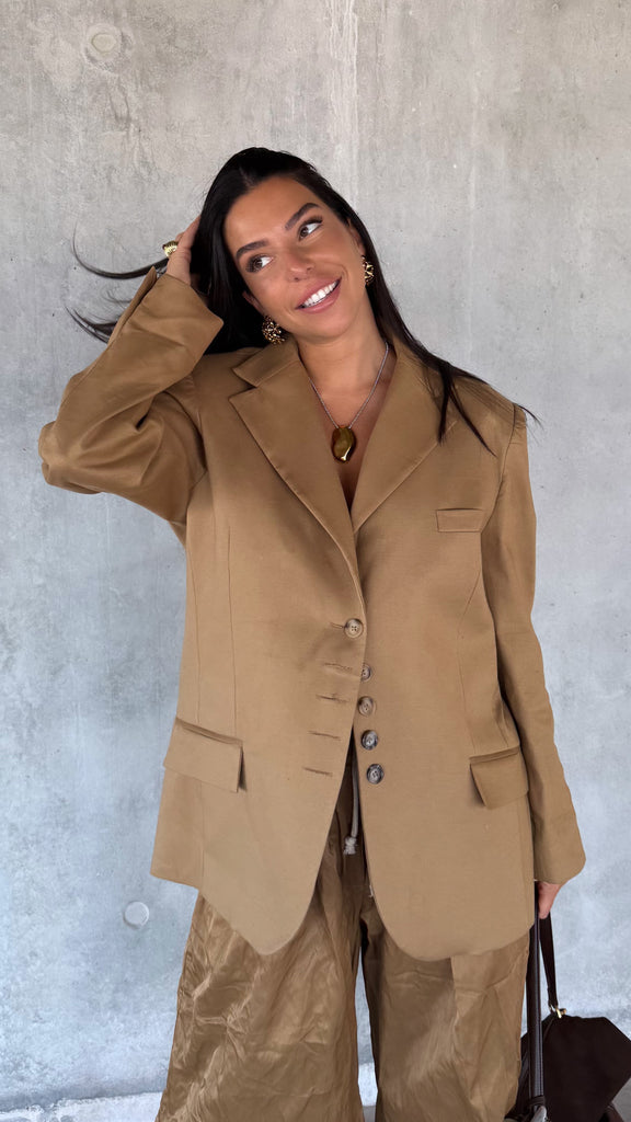 Le blazer Atelier Olive se porte aussi bien ouvert qu’ajusté, sur une chemise oversize ou un top près du corps, selon l’allure souhaitée.