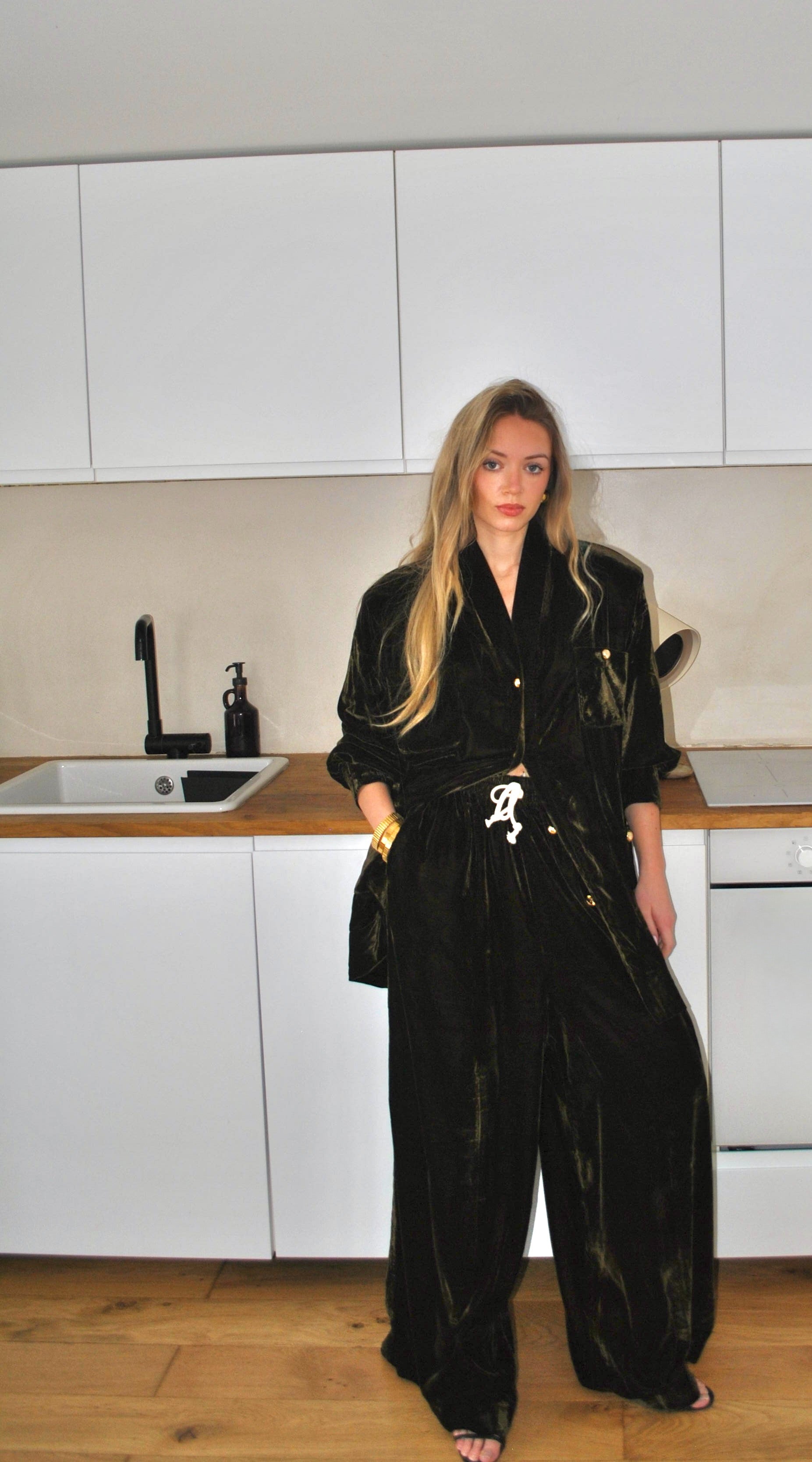 Un ensemble oversize en velours polyester–viscose, fluide et texturé, pensé pour offrir une allure couture sans compromis sur le confort.
