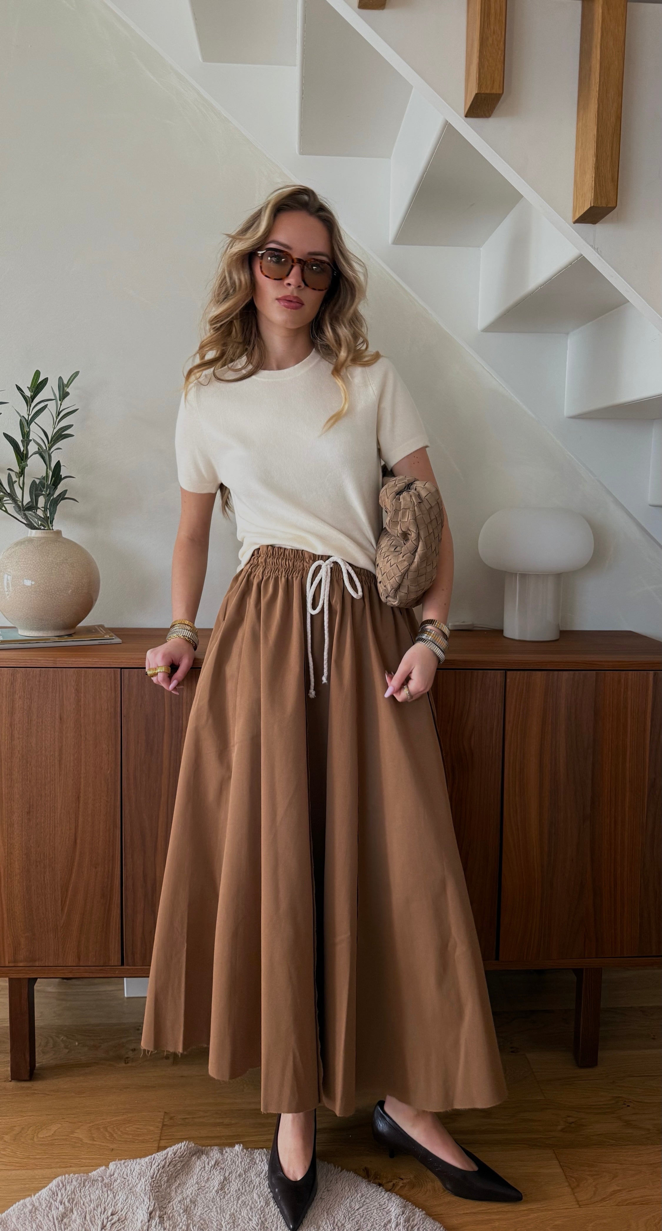 Confectionnée en toile de coton, cette jupe évasée allie confort et caractère. Sa taille élastiquée, ajustable grâce à un cordon en coton, s’adapte naturellement à la silhouette tout en assurant une aisance au quotidien.