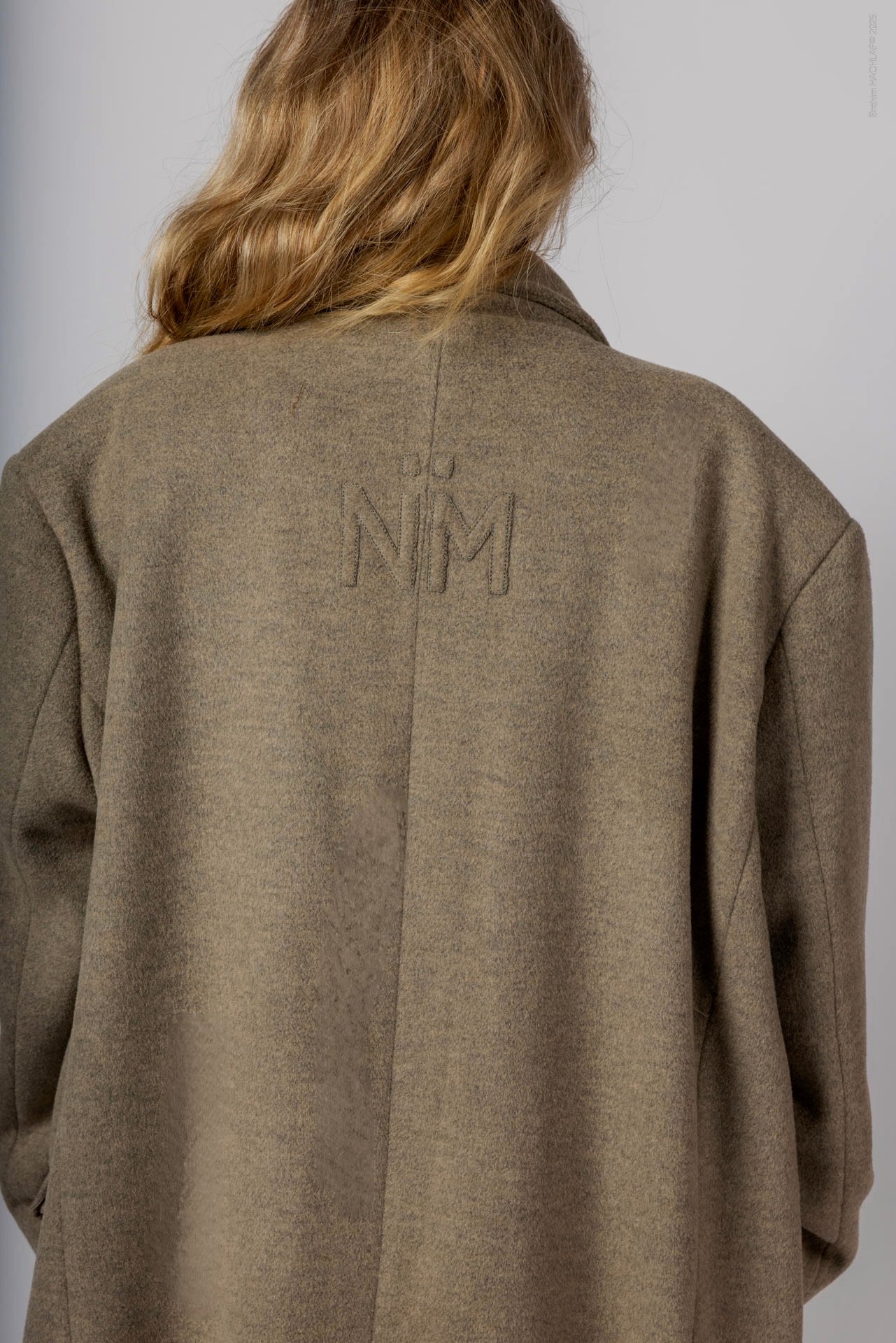 une broderie NM ton-sur-ton, subtile, élégante, intégrée directement dans le dos du manteau.