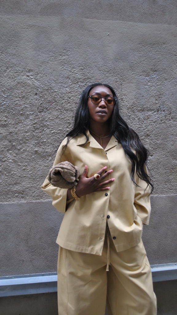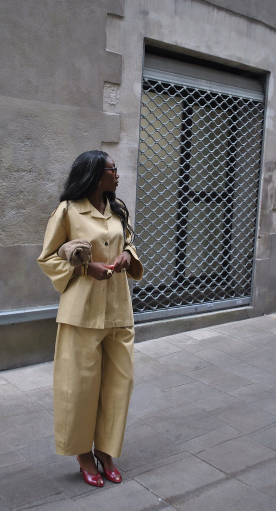 Confectionné en toile de coton au toucher effet jean avec une touche d’élasthanne, il offre à la fois maintien et souplesse. La chemise oversize, à col plat et manches larges, se distingue par sa coupe fluide et ses boutons contrastés.